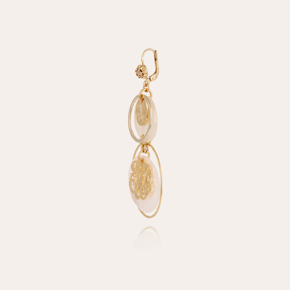 Deze gouden oorbellen parelmoer van Gas Bijoux combineren elegantie met een subtiele schittering. De twee witte parelmoeren medaillons zorgen voor een zachte, luxe uitstraling. Daardoor zijn deze oorbellen perfect voor zowel dagelijks gebruik als speciale gelegenheden.