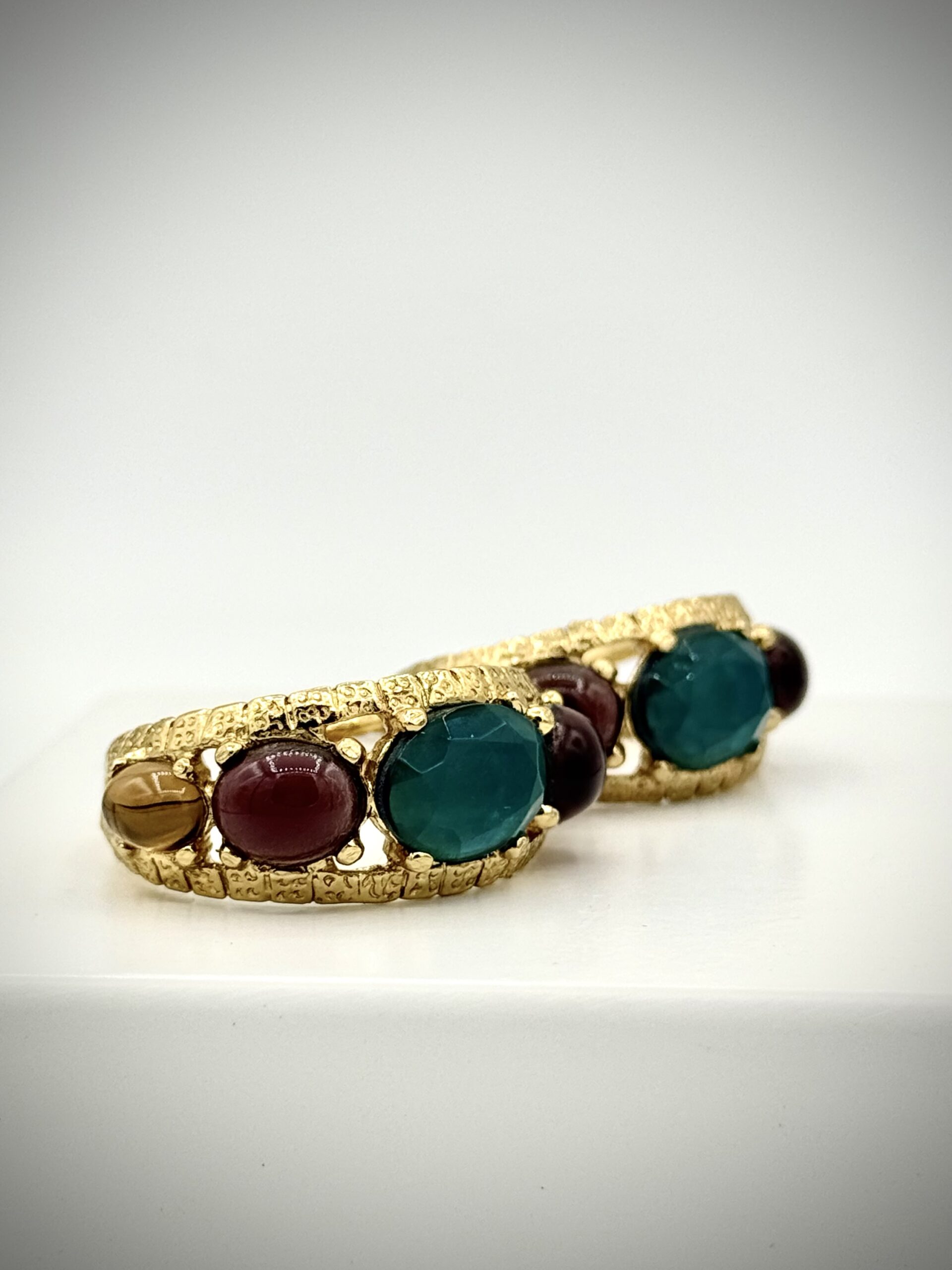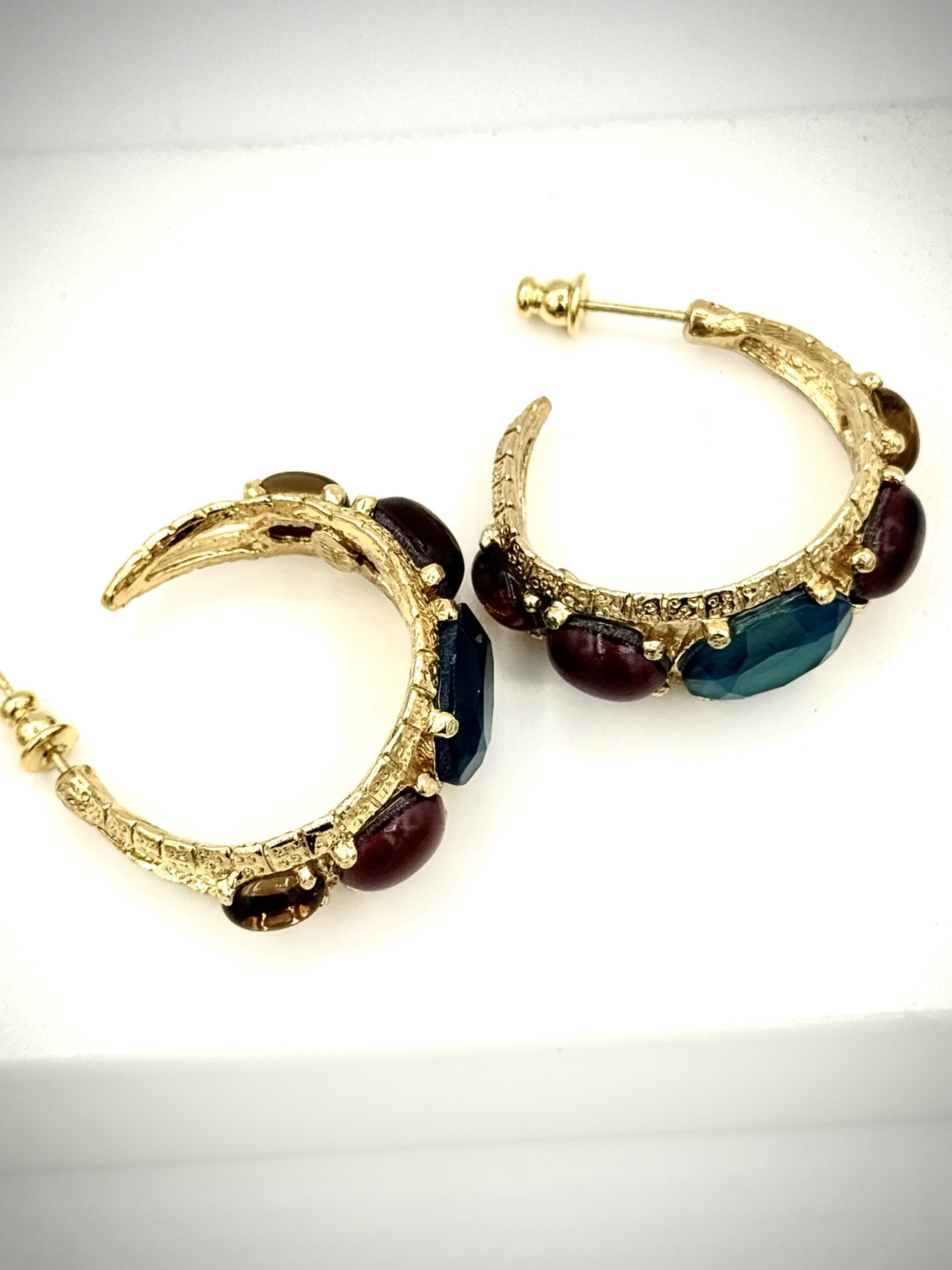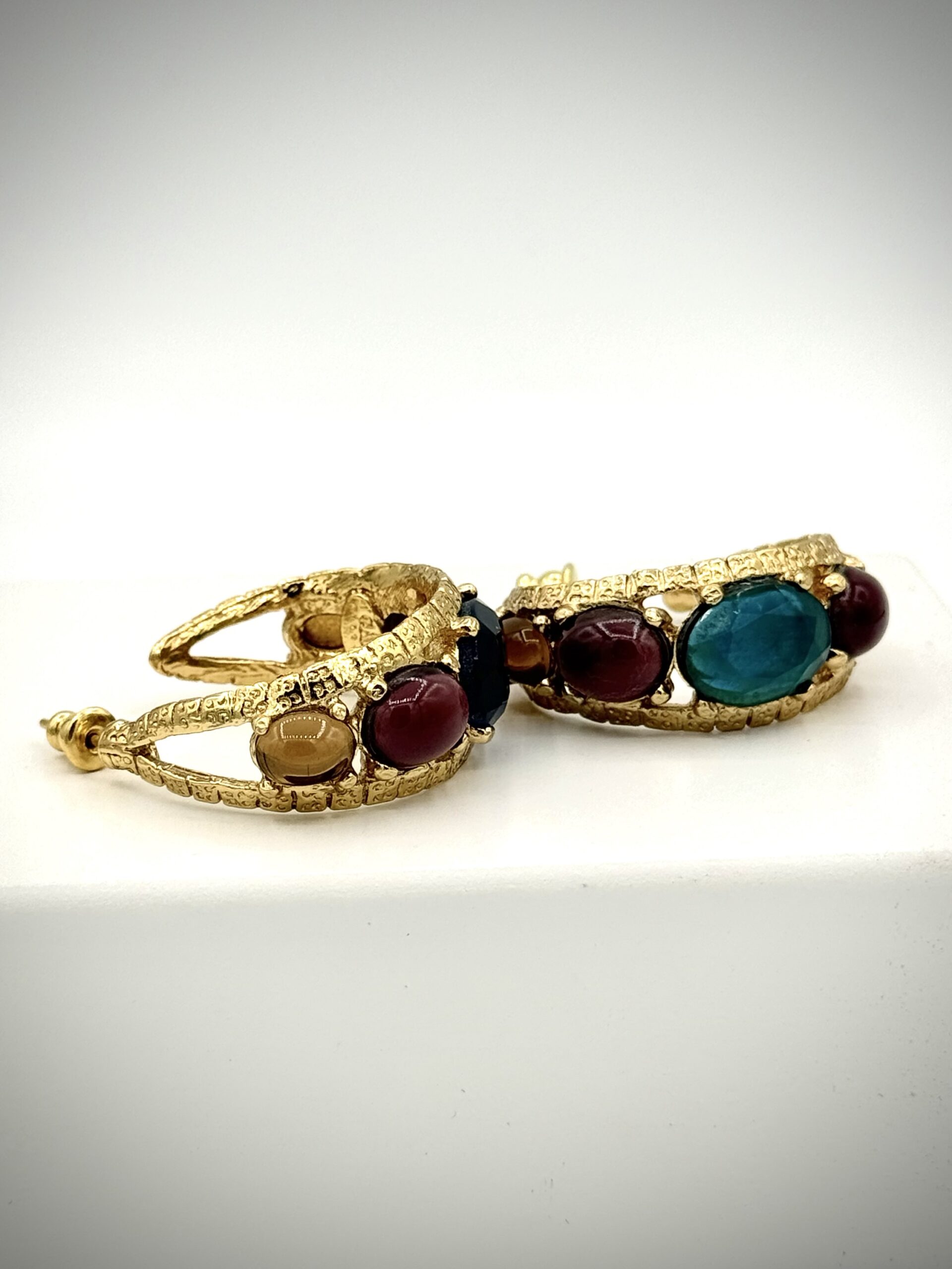 Vergulde statement oorbellen van Gas Bijoux met gekleurde stenen in blauwgroen, rood en bruin. Luxe bohemian design en comfortabel draagbaar.