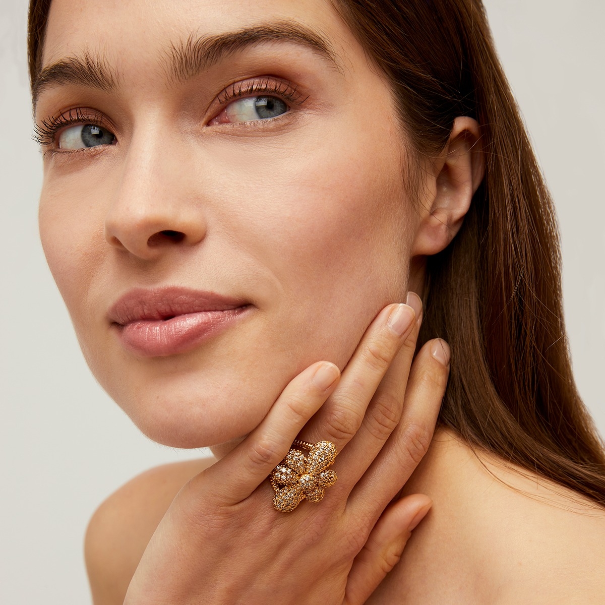 De ring is afgewerkt met een fijne pavézetting van zirkonia. Hierdoor vangt het sieraad het licht op een subtiele manier. Bovendien geeft de reliëfachtige bloem een unieke en stijlvolle uitstraling.
