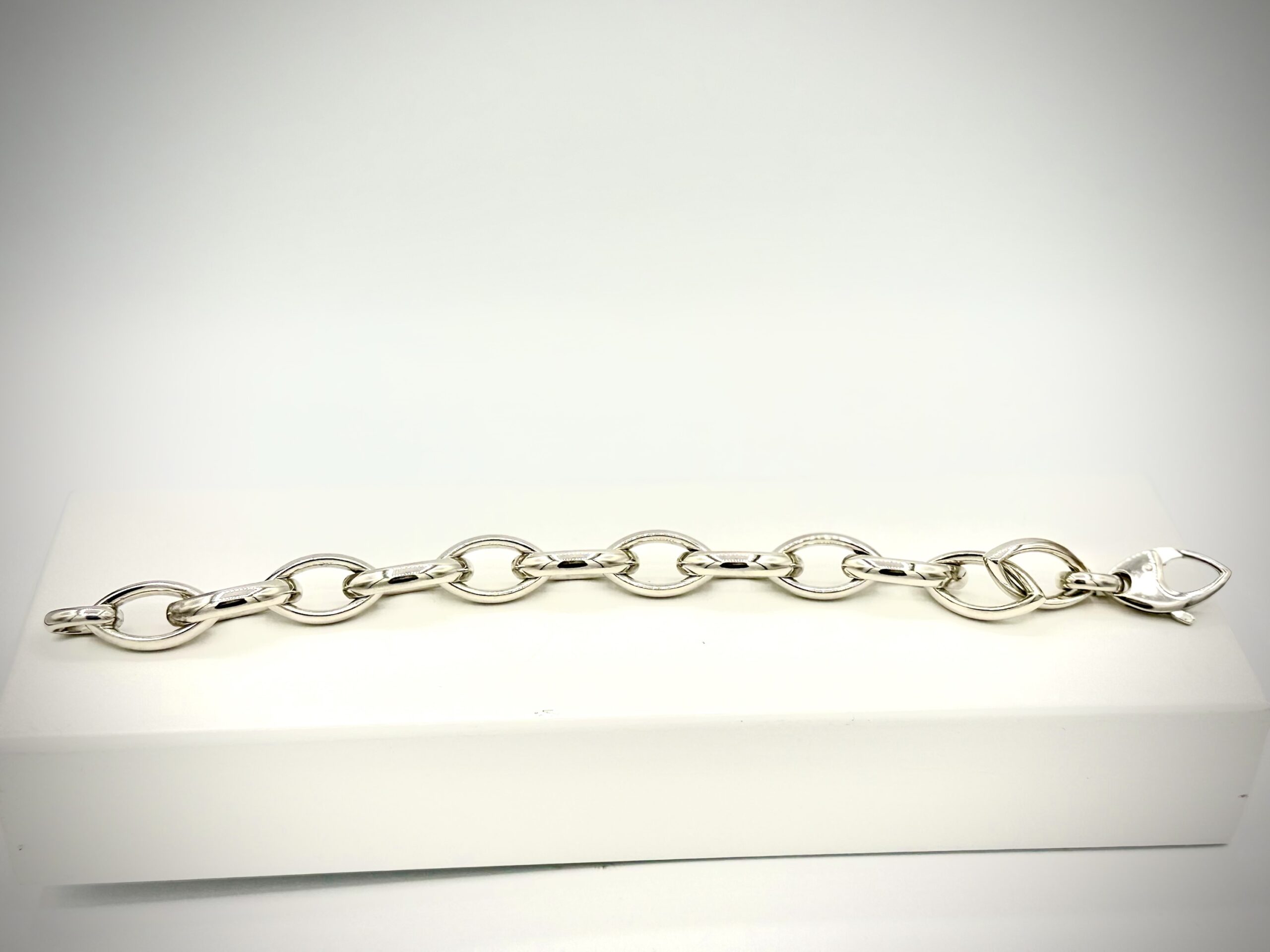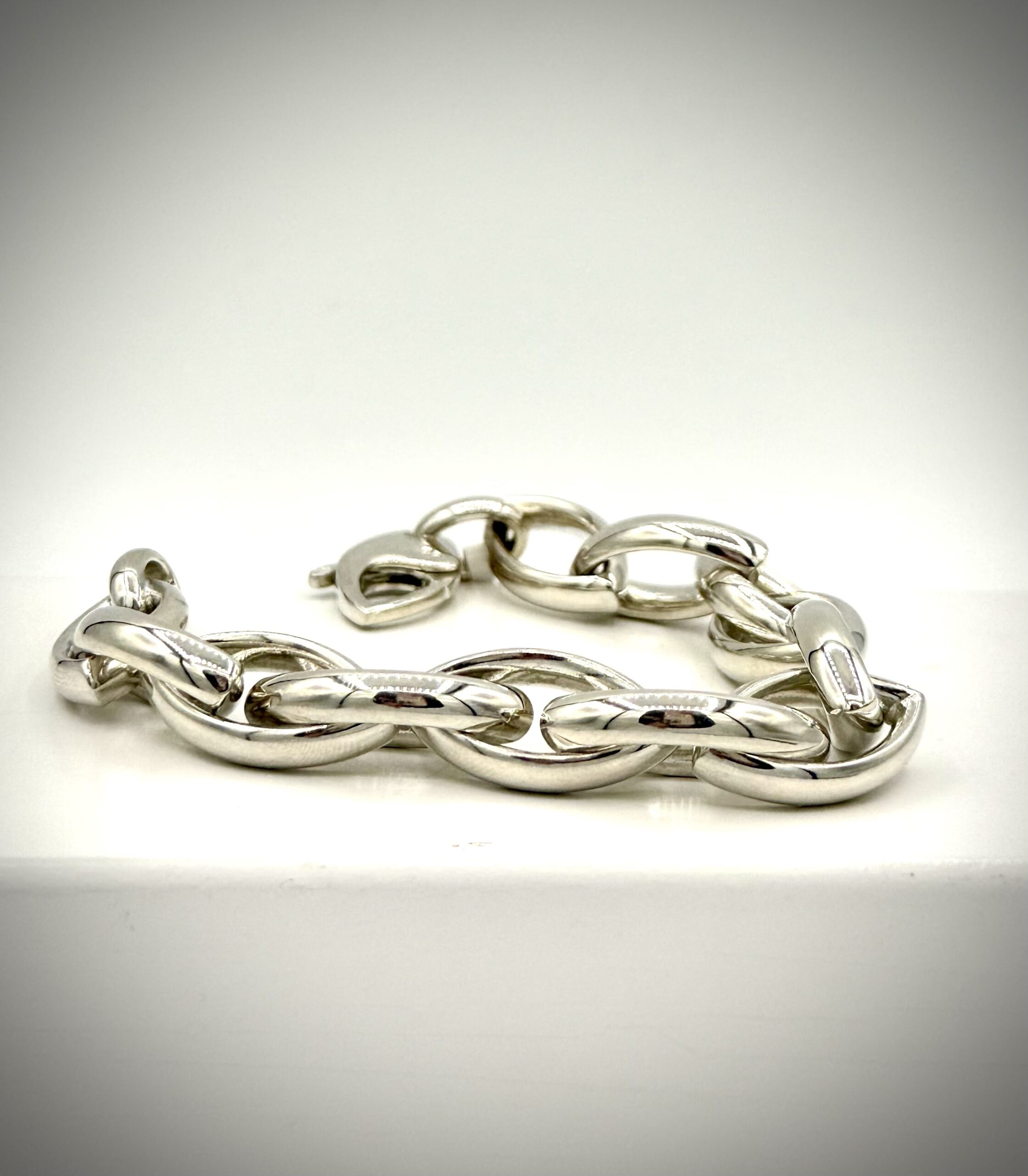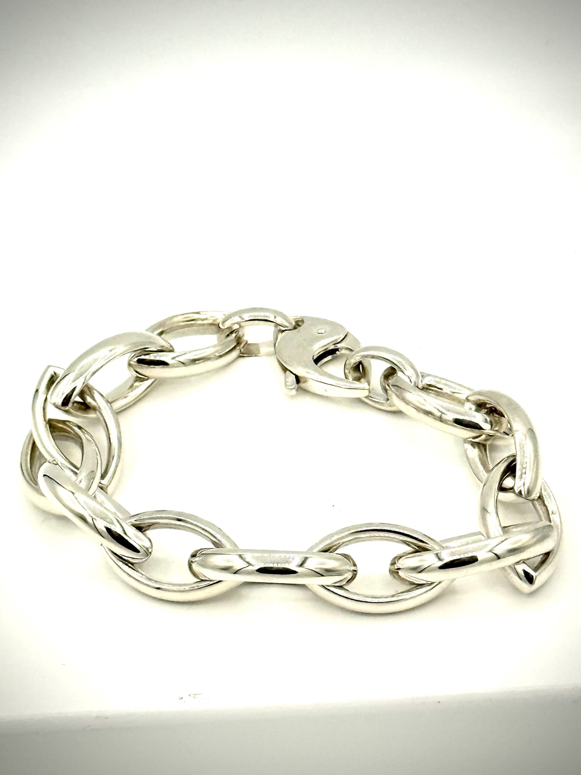 Deze handgemaakte zilveren armband heeft een strak en tijdloos schakelontwerp met ovale ringen die zorgen voor een elegante maar krachtige uitstraling. Elke schakel is met zorg vervaardigd en hoogglans afgewerkt, wat het vakmanschap duidelijk zichtbaar maakt.